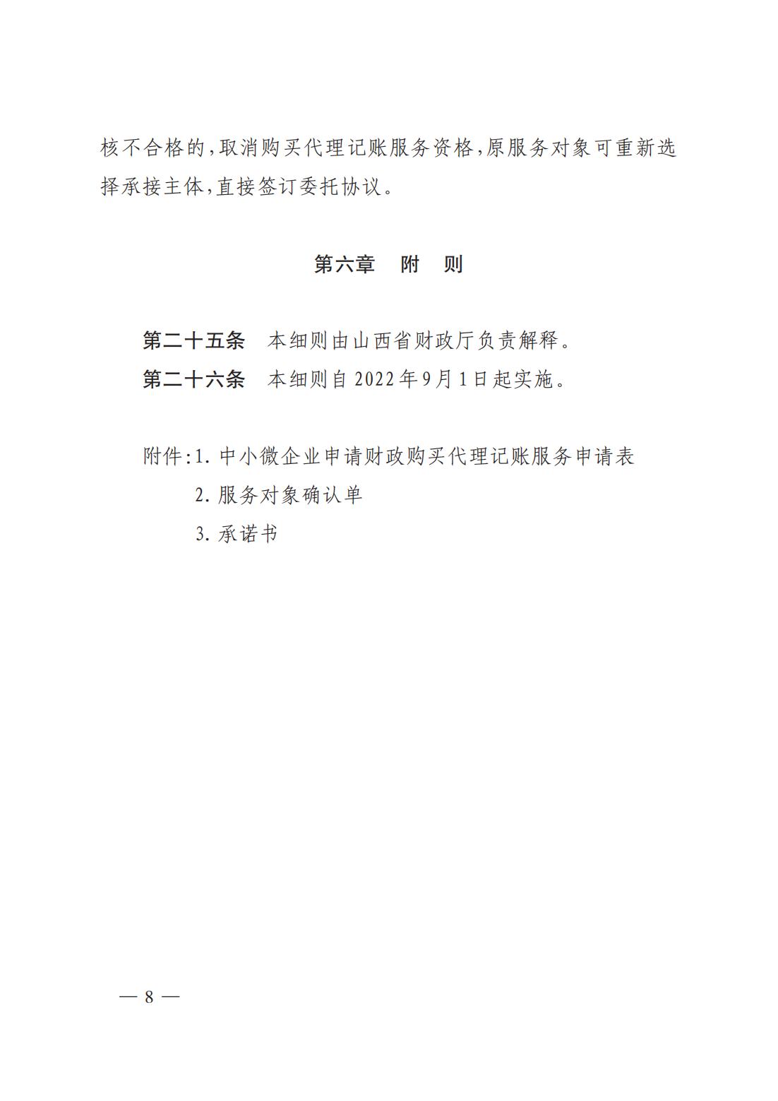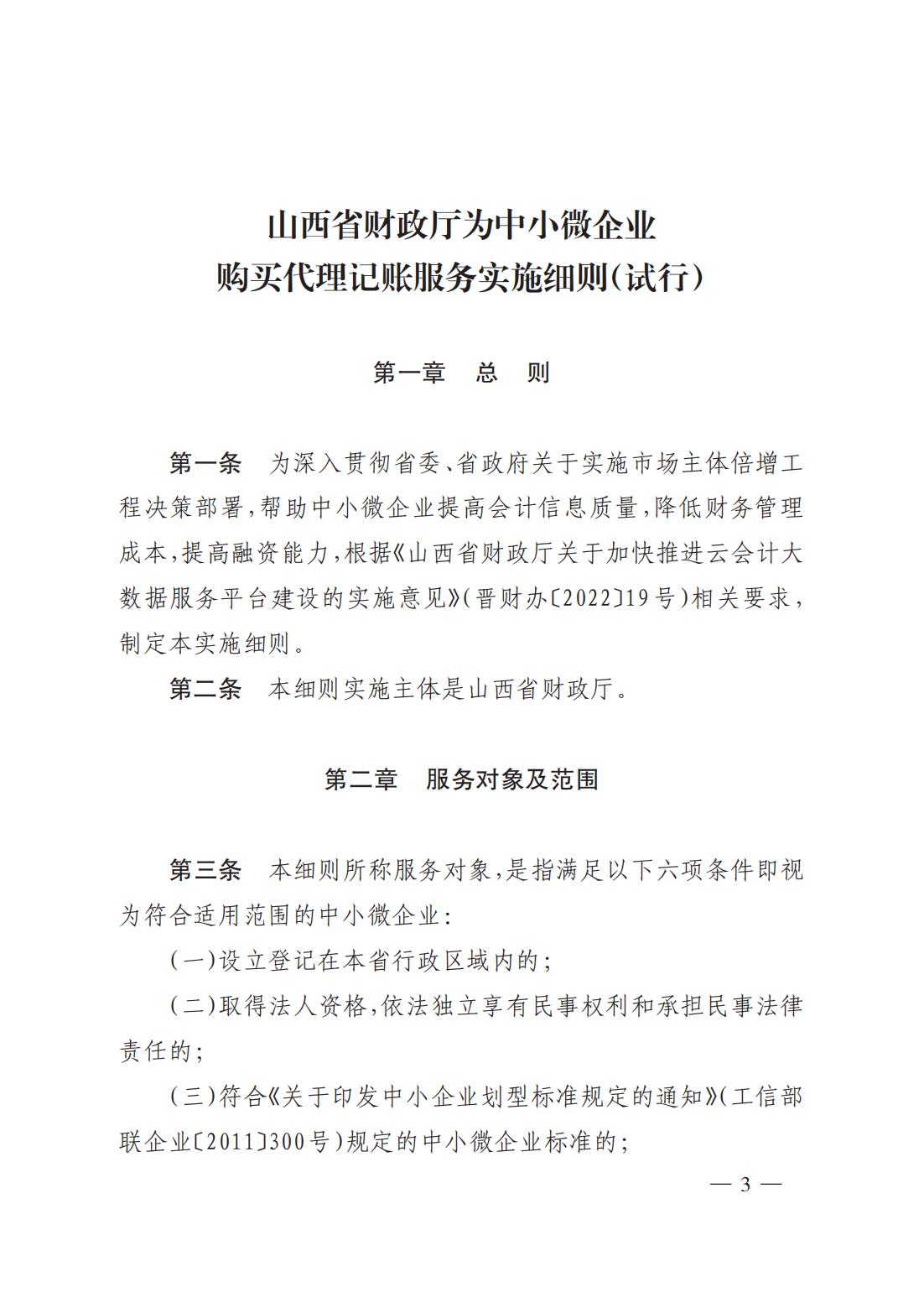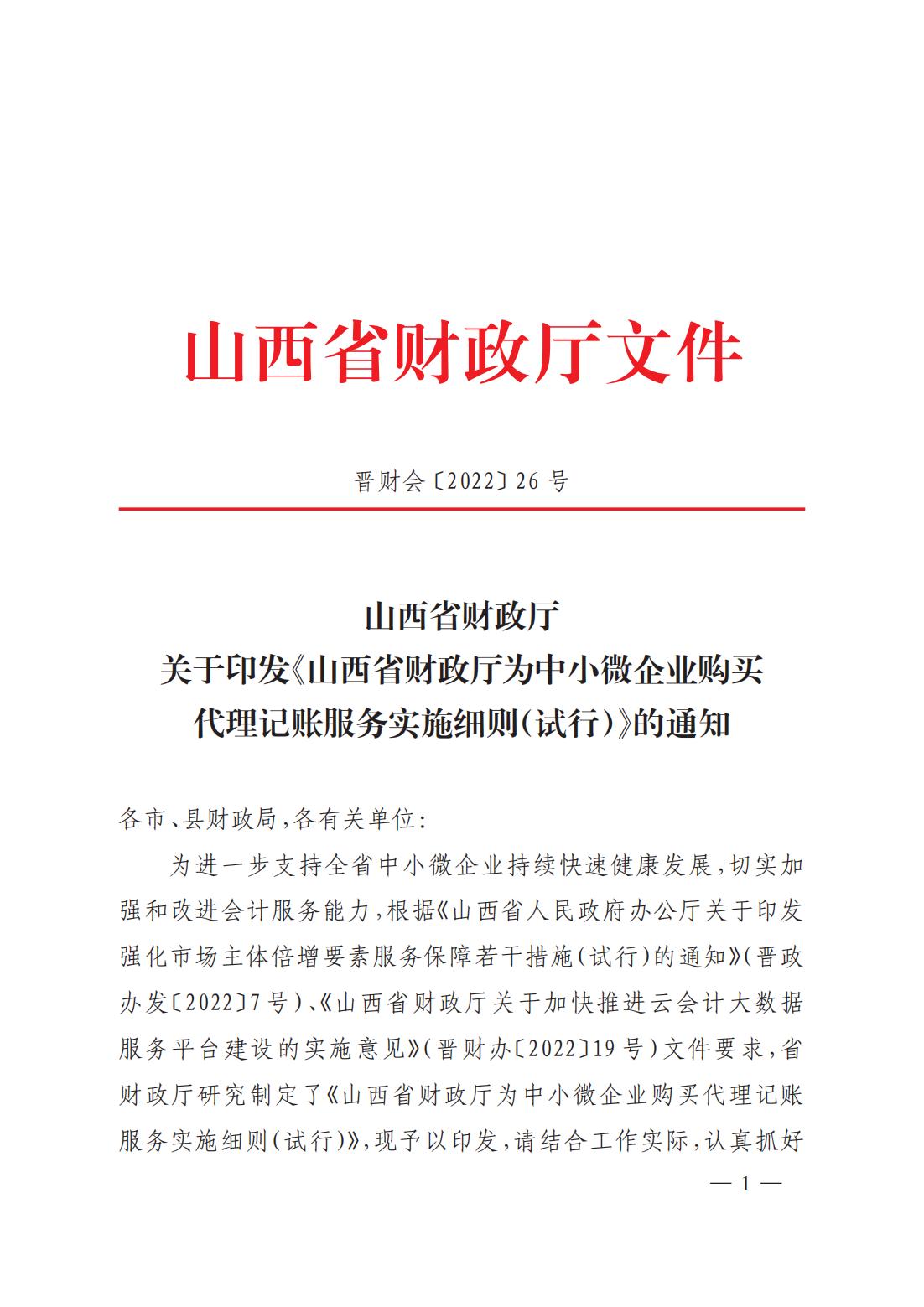 為進一步支持全省中小微企業(yè)持續(xù)快速健康發(fā)展,切實加強和改進會計服務(wù)能力,根據(jù)《山西省人民政府辦公廳關(guān)于印發(fā)強化市場主體倍增要素服務(wù)保障若干措施(試行)的通知》(晉政辦發(fā)〔2022〕7 號)、《山西省財政廳關(guān)于加快推進云會計大數(shù)據(jù)服務(wù)平臺建設(shè)的實施意見》(晉財辦〔2022〕19 號)文件要求,省財政廳研究制定了《山西省財政廳為中小微企業(yè)購買代理記賬服務(wù)實施細則(試行)》,現(xiàn)予以印發(fā),請結(jié)合工作實際,認真抓好貫徹落實。